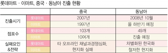 롯데마트의 성공적인 동남아 진출에 이마트(대표 김해성·이갑수)도 올 연말까지 베트남에 진출하겠다고 선포했다. 지난해 12월 이마트 베트남 법인을 세우고 현지인 위주의 직원 채용도 시작했다. 정용진 신세계그룹 부회장은 롯데마트와는 반대되는 '철저한 현지화'정책을 펼친다는 전략이다. 하지만 이마트의 현지화 전략은 이미 중국 시장에서 고배를 마신 바 있다. 업계는 테스코와 까르푸가 동남아 시장에서 '현지화'에 성공해 자리를 잡은 이상 후발 주자인 국내 업체가 시장에 진입하기 위해서는 경쟁사를 넘는 무언가가 있어야할 것으로 보고 있다.