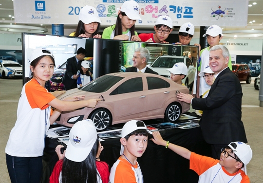 28일 한국지엠 부평 본사 홍보관에서 진행된 오토 사이언스 캠프 입소식에서 세르지오 호샤 한국지엠 사장(오른쪽)이 캠프에 참석한 학생들과 자동차 클레이 모형을 함께 살피며 담소를 나누고 있다.