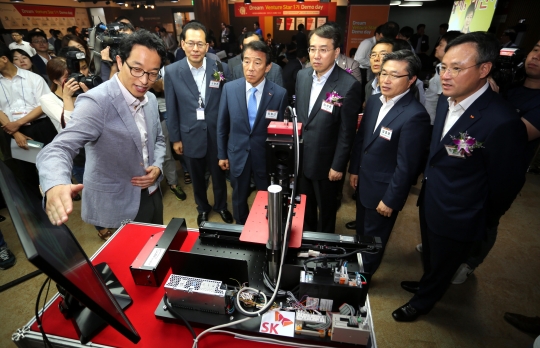 김창근 SK수펙스추구협의회 의장(오른쪽 네번째)이 이석준 미래창조과학부 1차관(오른쪽 세번째), 임종태 대전센터장(오른쪽 두번째) 등과 함께 지난 23일 대전창조경제혁신센터에서 열린 드림벤처스타의 데모 데이에서 제품 설명을 듣고 있다/ SK그룹 제공
