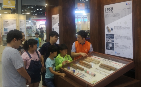 29일 ㈜한화 직원이 대한민국 과학기술 70선 중 1950년대 대표기술로 선정된 한화의 화약제조기술에 대해 어린이들에게 설명하고 있다. / ㈜한화 제공