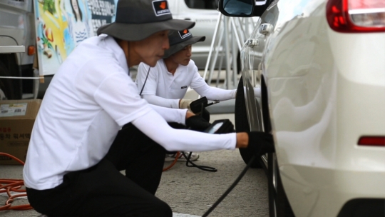 한국타이어 정비사가 타이어 공기압을 점검하고 있다.