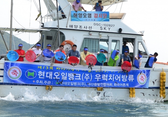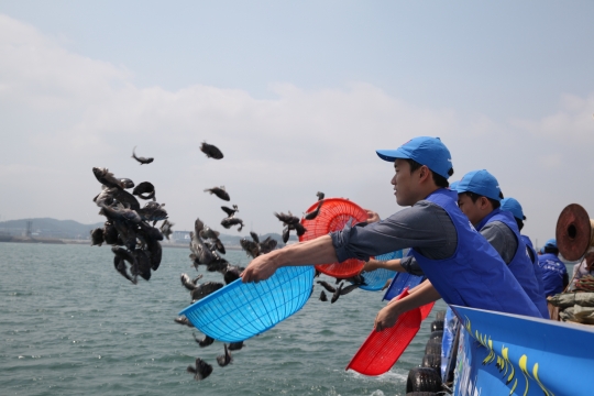 현대오일뱅크 직원들이 삼길포 해역에 우럭을 방류하고 있다.