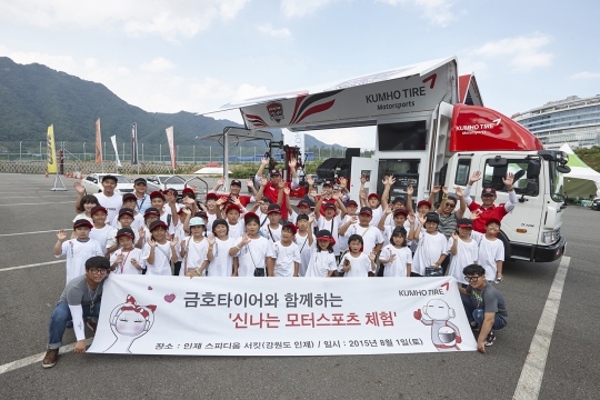 금호타이어 관계자(오른쪽)가 1일 강원도 인제 스피디움 서킷에서 초등학생들에게 모터스포츠 교육을 하고 있다.