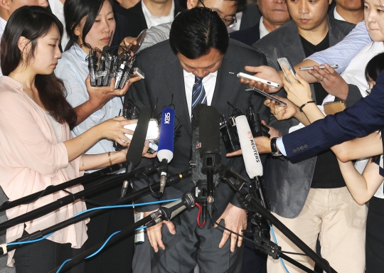 신동빈 롯데그룹회장이 3일 오후 2시30분 김포국제공항을 통해 입국, 경영권 분쟁과 관련한 사태에 대해 고개숙여 사과하고 있다./손진영 기자