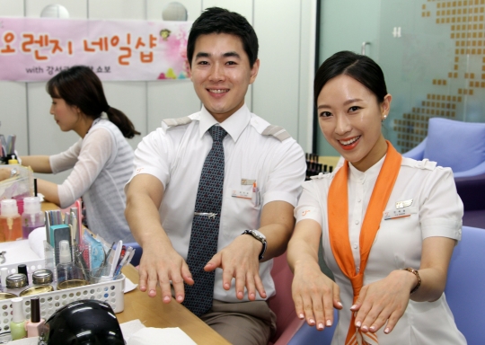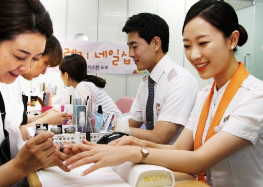 제주항공 승무원들이 여직원 휴게실에서 손톱관리 서비스를 받고 있다.