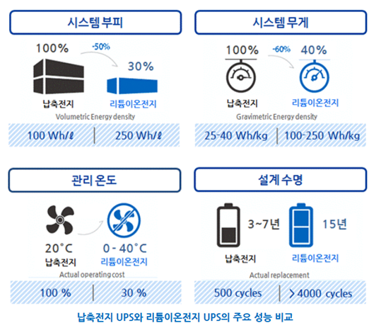 1000kW 용량의 UPS를 15분 대응한다고 가정했을 시, 납축전지는 500kWh가 필요한 반면 리튬이온전지는 250kWh만 있으면 된다.