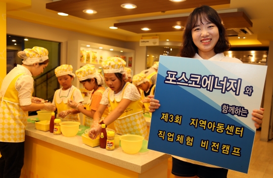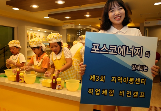 14일 '직업체험 비전캠프'에 참여한 지역아동센터 어린이들이 음식만들기 체험을 하고 있다. / 포스코에너지 제공