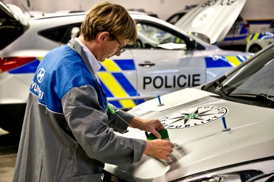 현대자동차 체코공장에서 한 작업자가 ix35 경찰차 보닛 후드에 경찰 로고를 부착하고 있다.