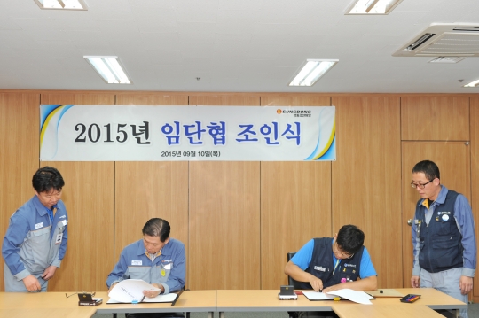 9일 구본익 성동조선 대표이사(왼쪽 두 번째)와 정동일 전국금속노조 성동조선지회장(오른쪽 두 번째)가 임단협 합의서에 서명하고 있다. / 성동조선 제공