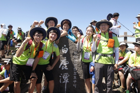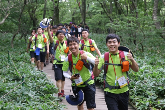 현대모비스 신입사원 419명이 한라산 정상에 올라 단체사진을 찍고 있다.