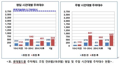 6월 하루 평균 446대에 불과하던 롯데월드몰 고객 주차대수는 7월 주차제도 조정이후 1740대, 8월에는 2511대로 늘었으나 9월(1~11일) 들어서는 하루 평균 1575대로 다시 줄었다.