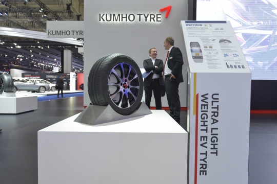 금호타이어는 최근 개발한 초경량화 제품 '와트런(WATTRUN)'을 전시했다.