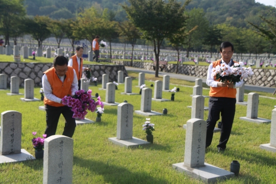 24일 한화 임직원들이 국립서울현충원에서 묘역 정비 활동을 하고 있다. / 한화 제공