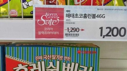 30일 SNS 상에서는 한 마트에서 '코리아 블랙프라이데이'라는 문구와 함께 올라온 과자 가격표 사진이 네티즌들의 비웃음을 사기도 했다. 가격표에는 1290원에서 1200원으로 조정한 값이 적혀 있다. 할인 행사의 대명사인 '블랙프라이데이'를 걸어 놓고 90원을 깎아 놓은 것이다.