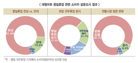 전통시장 상인의 69%가 대형마트 평일 휴무를 원하는 것으로 나타났다. 주말에 대형마트가 쉰다고 해서 전통시장을 찾는 고객이 늘지 않기 때문이다. 오히려 종교적, 개인적 이유로 일요일에 쉬고 싶다는 상인들이 많았다. /손진영 기자