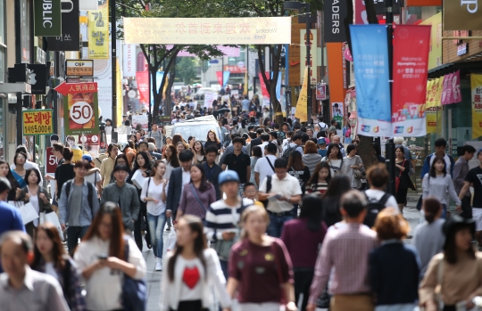 중국 국경절 연휴를 하루 앞두고 서울 중구 명동이 평일에도 불구하고 쇼핑 나온 중국인 관광객들로 붐비고 있다./연합