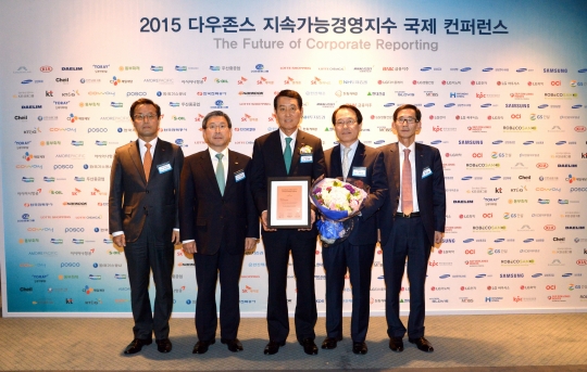 28일 서울 그랜드 하얏트 호텔에서 열린 '2015 다우존스 지속가능경영지수 인증식'에서 성세환 BNK금융그룹 회장(가운데)이 DJSI 아시아퍼시픽지수 편입 인증패를 받고 있다.
