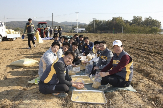 10월 31일 충북 정안마을에서 열린 'KB희망나눔 농촌봉사활동'에 참가한 KB손해보험 김병헌 사장(우측 첫 번째)과 직원들이 콩 수확을 하고 있다.