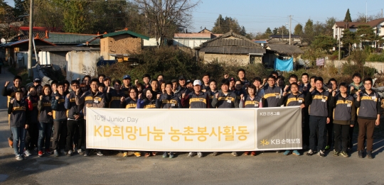 10월 31일 충북 정안마을에서 열린 'KB희망나눔 농촌나눔캠프'에 참가한 KB손해보험 김병헌 사장과 직원들이 단체사진을 촬영하고 있다.