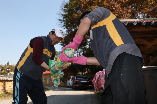 10월 31일 충북 정안마을에서 열린 'KB희망나눔 농촌나눔캠프'에 참가한 KB손해보험 김병헌 사장(좌측)과 직원들이 이불 빨래를 하고 있다.