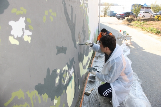 10월 31일 충북 정안마을에서 열린 'KB희망나눔 농촌나눔캠프'에 참가한 직원들이 마을 벽화를 그리고 있다.