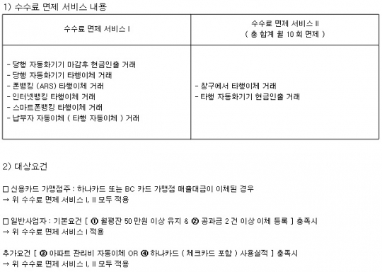 신용카드 가맹점주는 이 통장을 신용카드 매출대금(하나카드 및 BC카드) 입금계좌로 지정하면 인터넷뱅킹 타행이체 거래 등 대부분의 은행거래 수수료가 무제한 면제된다.