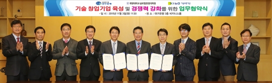 3일 대구은행 본점에서 (왼쪽부터) DGB대구은행 여신본부 장영철 부행장, 계명대학교 글로벌창업대학원 신진교 원장, 기술보증기금 대구영업본부 곽영철 본부장이 업무협약을 체결했다.
