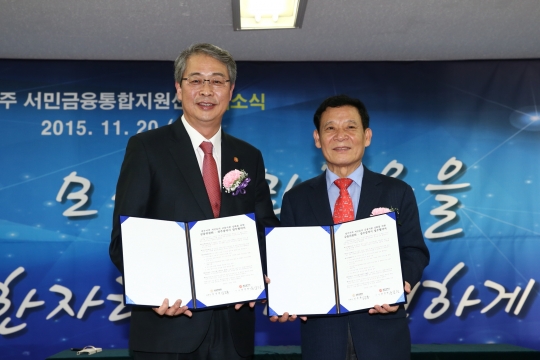 임종룡 금융위원장(왼쪽)과 윤장현 광주시장이 금융위-광주시 간 서민금융지원 업무협약을 맺었다.
