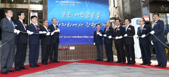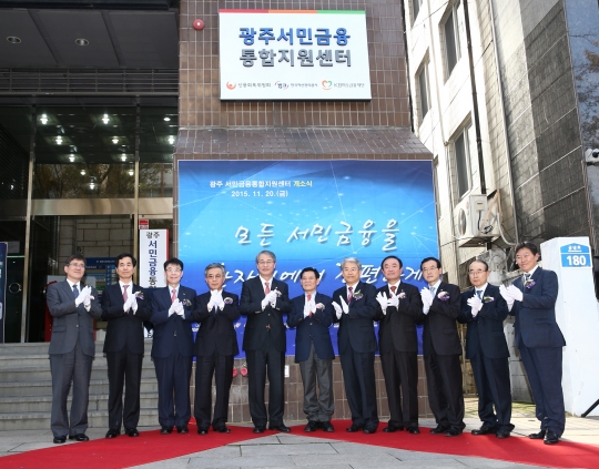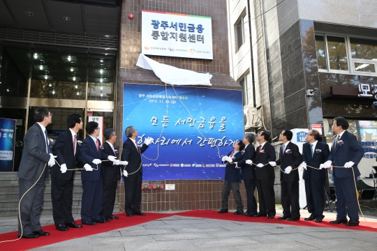 광주 서민금융 통합지원센터 현판 제막식에서 (왼쪽부터) 조현수 신용보증재단중앙회 전무, 박세춘 금감원 부원장, 김윤영 신복위 위원장, 이종휘 미소금융중앙재단 이사장, 임종룡 금융위원장, 윤장현 광주시장, 김동철 의원, 장병완 의원, 임내현 의원, 이장홍 대한저축은행 대표이사, 임승우 광주전통시장연합회장이 기념촬영을 하고 있다.