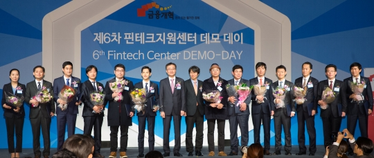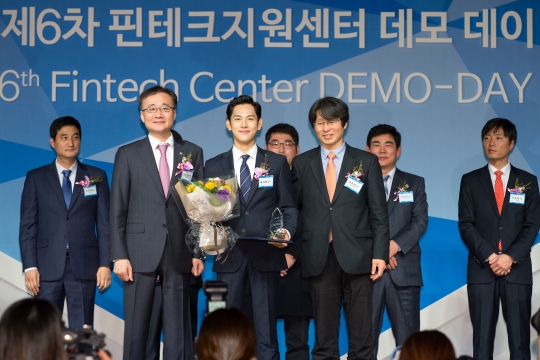 정찬우 금융위 부위원장이 핀테크 홍보대사인 배우 임시완을 비롯해 40명의 핀테크 산업 육성 공로자에게 표창을 수여하고 있다.