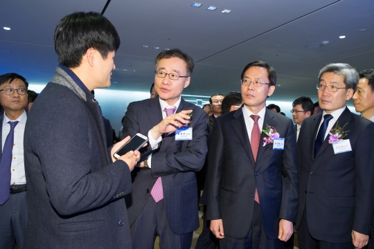 임종룡 금융위원장(가운데)이 임시완 핀테크 홍보대사(오른쪽)온라인 보험 슈퍼마켓인 '보험 다모아' 시연을 하고 있다.