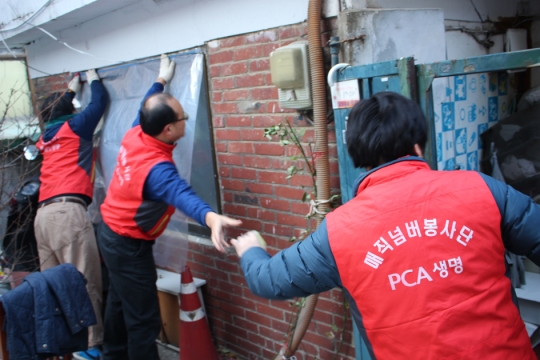지난해 PCA매직넘버봉사단이 서울 은평구의 저소득 어르신 가정을 방문해 방한 작업을 진행하는 모습.