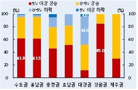 반면 그간 주택공급 물량이 많았던 충청권과 주택가격 상승폭이 컸던 대경권의 경우 하락한다는 응답이 50%를 상회했다.