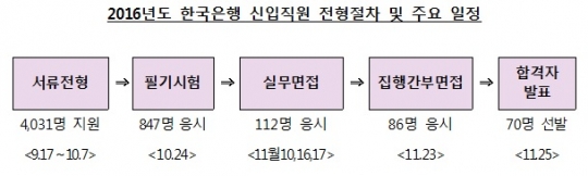 한국은행이 2016년도 신입 종합기획직원(G5) 합격자 70명을 발표했다.