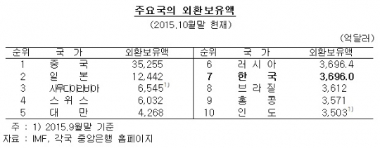 10월말 기준 우리나라의 외환보유액 규모는 세계 7위 수준이다.