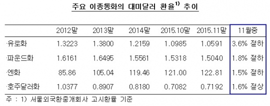 주요 이종통화의 대미달러 환율 추이를 보면 유로화는 3.6% 절하, 파운드화는 1.8% 절하, 엔화는 1.5% 절하, 호주달러화는 1.6% 절상됐다.