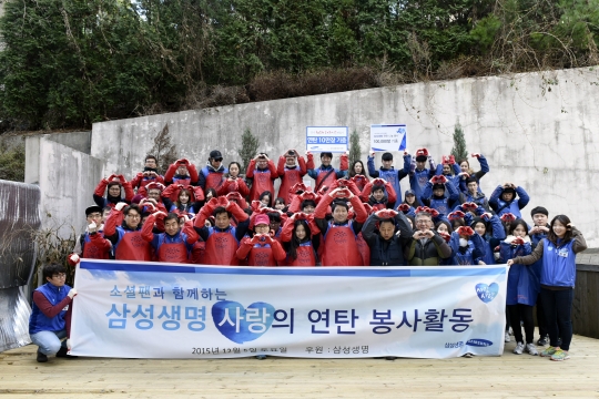 5일 삼성생명 임직원과 고객이 서울 상계동에서 연탄을 배달한 뒤 이상호 삼성생명 마케팅팀장(첫째 줄 왼쪽 7번째), 허기복 밥상공동체 연탄은행 대표(첫째 줄 왼쪽 8번째)와 기념사진을 찍고 있다.