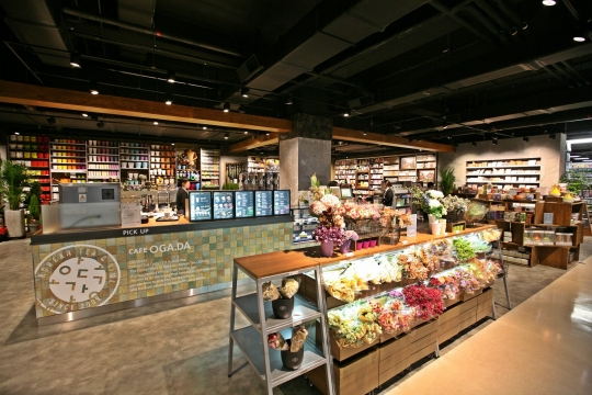 롯데마트 양덕점 1층에 위치한 페이지그린 매장. 이곳에는 원예상품과 서적이 진열됐다. 고객이 쉴수 있는 의자와 카페도 위치해 힐링공간으로 활용되고 있다. /롯데마트