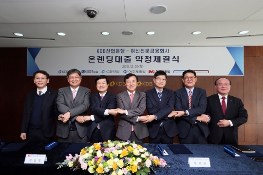 29일 서울 여의도 산업은행 본점에서 아주캐피탈 이도용 상무, 산은캐피탈 최윤석 부사장, 한국캐피탈 김철영 대표이사, 산은 나성대 부행장, 현대캐피탈 우상현 전무, 현대커머셜 김병희 전무, DGB캐피탈 송성윤 부사장(왼쪽부터)이 온렌딩대출 지원약정을 체결하고 있다.