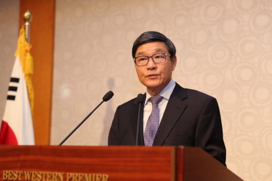 한국케이블TV방송협회 10대 회장으로 뽑힌 배석규 신임 회장이 12일 마포구 서울가든호텔에서 취임사를 하고 있다. /케이블TV협회
