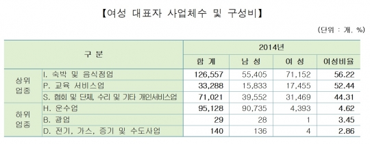 산업별 여성 대표자 비율은 숙박·음식점업 56.22%, 교육 서비스업 52.44%, 개인 서비스업 44.31% 순으로 높게 나타났다. 전기·가스·수도사업(2.86%), 광업(3.45%), 운수(4.62%)는 낮은 편이었다.