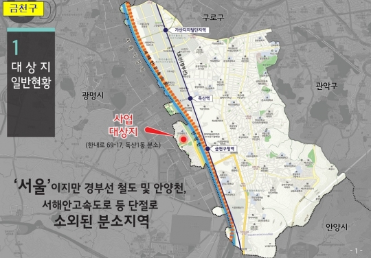 금천구 독산1동 공공건축물은 현재 치안센터와 주민센터 분소가 위치해있다.