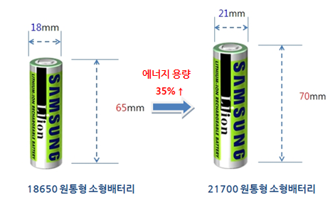 기존 18650 원통형 리튬이온 배터리와 에너지 용량이 35% 늘어난 21700 원통형 리튬이온 배터리. /삼성SDI