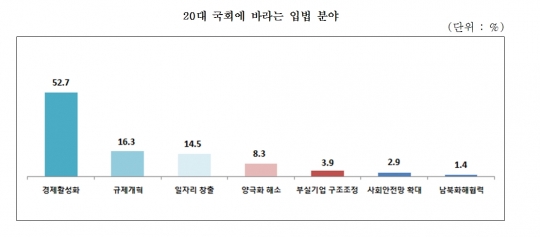 20대 국회에 바라는 입법 분야 역시 '경제활성화'가 52.7%로 압도적이었다. '규제개혁'(16.3%), '일자리 창출'(14.5%), '양극화 해소'(8.3%) 등에 대한 입법도 희망했다.