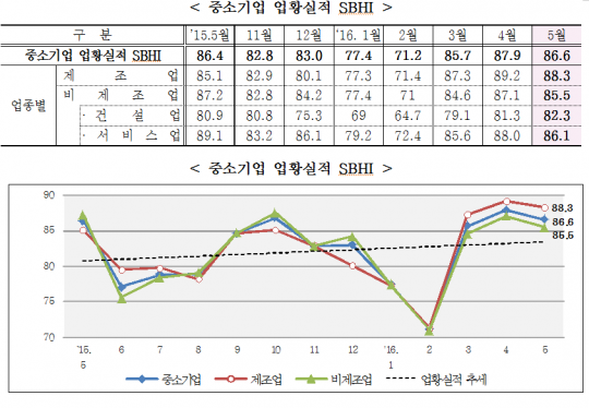 5월 중소기업 업황실적건강도지수는 86.6으로 전월대비 1.3포인트 하락했다. 제조업은 88.3으로 전월대비 0.9포인트 하락했다.