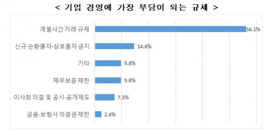 공정거래법상 대기업집단 규제 중 기업 경영에 가장 부담이 되는 내용은 '계열사 간 거래 규제'(56.1%)가 1순위에 올랐다. 이어 '신규 순환출자·상호출자 금지'(14.6%), '채무보증 제한'(9.8%), '이사회 의결 및 공시·공개제도'(7.3%), '금융·보험사 의결권 제한'(2.4%) 순이었다.