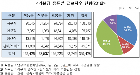 응답한 170개 기업 소속 근로자 35만9428명 가운데 연차가 올라갈수록 기본급을 인상하는 호봉제 근로자는 15만5723명으로 전체의 43.3%였다. 반면 직능급 근로자 12만2246명(34.1%), 직무급 근로자 3만8537명(10.7%) 등 소위 성과급이 적용되는 근로자는 44.8%였다.