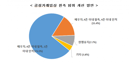 공시해야하는 친족범위도 '배우자, 4촌이내 혈족 2촌이내 인척'(73.1%) 또는 '배우자, 4촌이내 친인척'(15.4%)으로 완화해줄 것을 요청했다. 현재 대기업집단은 배우자, 6촌이내의 혈족, 4촌이내의 인척 전부에 대한 주민등록번호, 주식소유현황 등을 파악해서 공시해야 한다. 공시해야 할 친족 범위가 너무 넓어 어려움이 많다는 것이다.