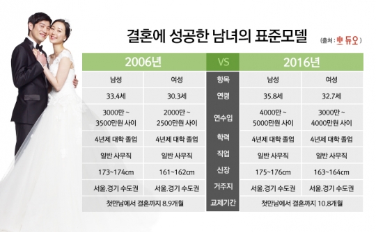 듀오의 '2016년 혼인통계 보고서'에 따르면 초혼 연령은 10년전인 2006년 당시의 남성 33.4세, 여성 30.3세에 비해 각각 2.4세가 올라갔다. 2015년 기준으로 첫 취업하는 연령(남성 23.4세, 여성 22.2세)을 감안하면 평균 10년 정도의 직장생활을 한 후 결혼을 하는 셈이다.