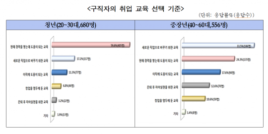 중장년 구직자들은 ▲기술 분야 중 '주택, 빌딩시설관리'(15.1%) ▲서비스 분야 중 '컨설턴트·강사 양성'(23.4%), ▲사무 분야 중 'OA사무자동화'(35.5%) 교육을 1순위로 선정했다.
